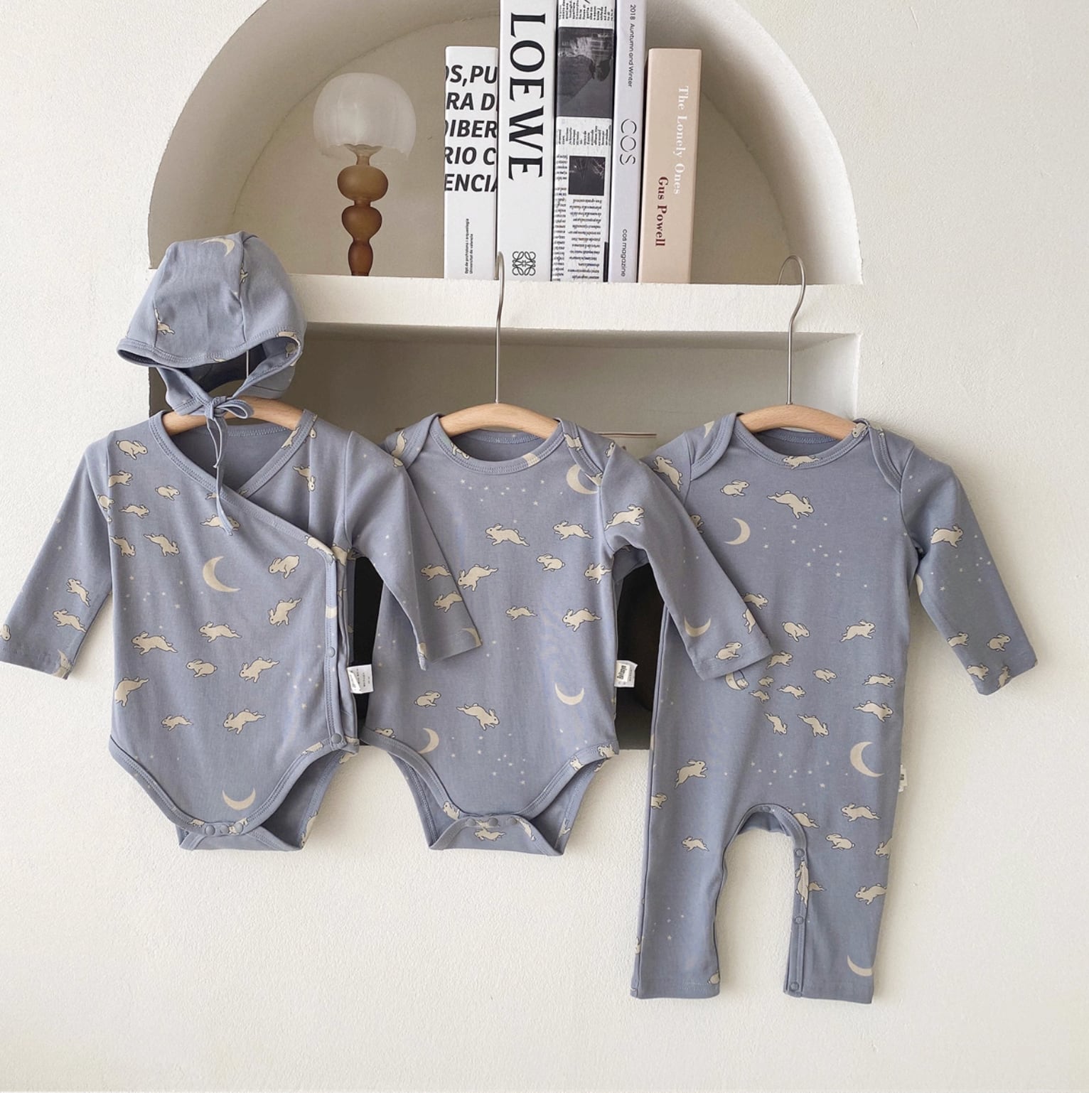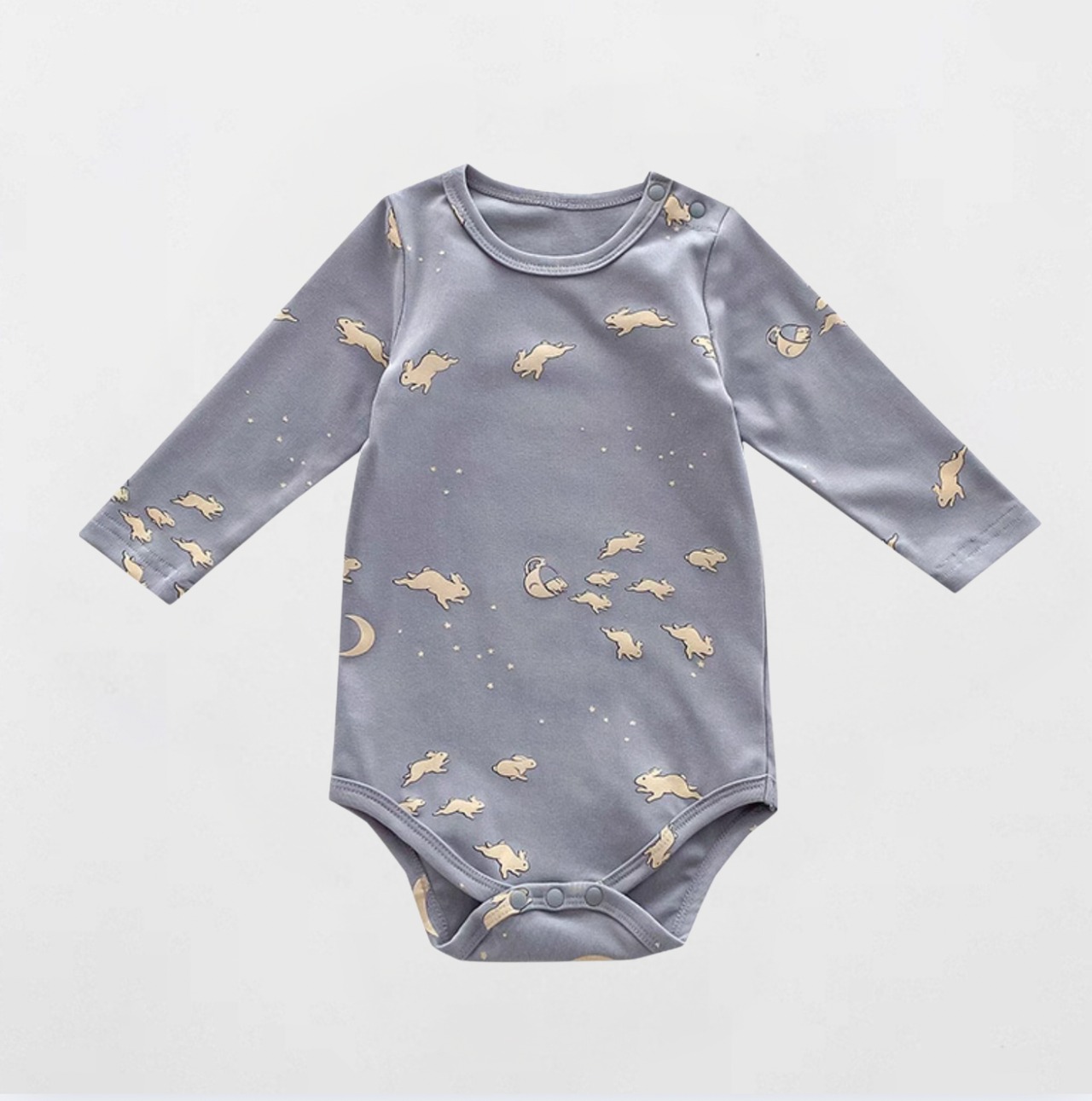 ペールブルーカラーがおしゃれな空を駆け回るうさぎ柄の長袖ロンパース。 あたたかくて柔らかな綿95%素材で赤ちゃんの肌に優しい着心地です。